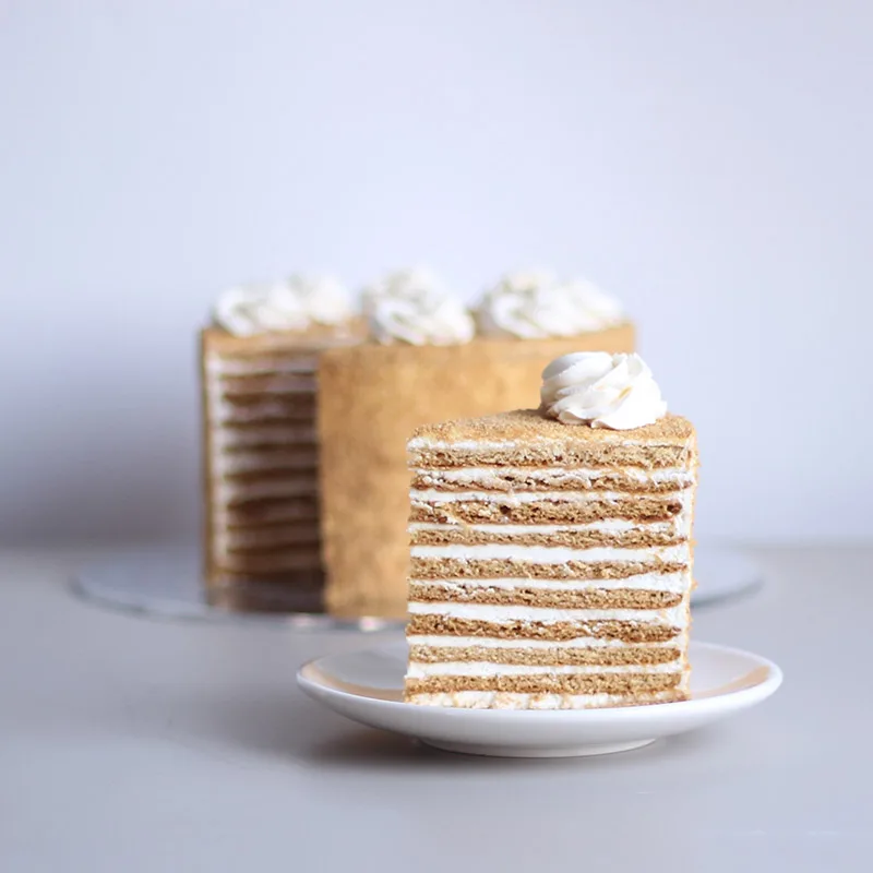 Тонкие медовые коржи, сливочно-сметанный крем. Грецкие орешки по желанию (оплачивается отдельно).